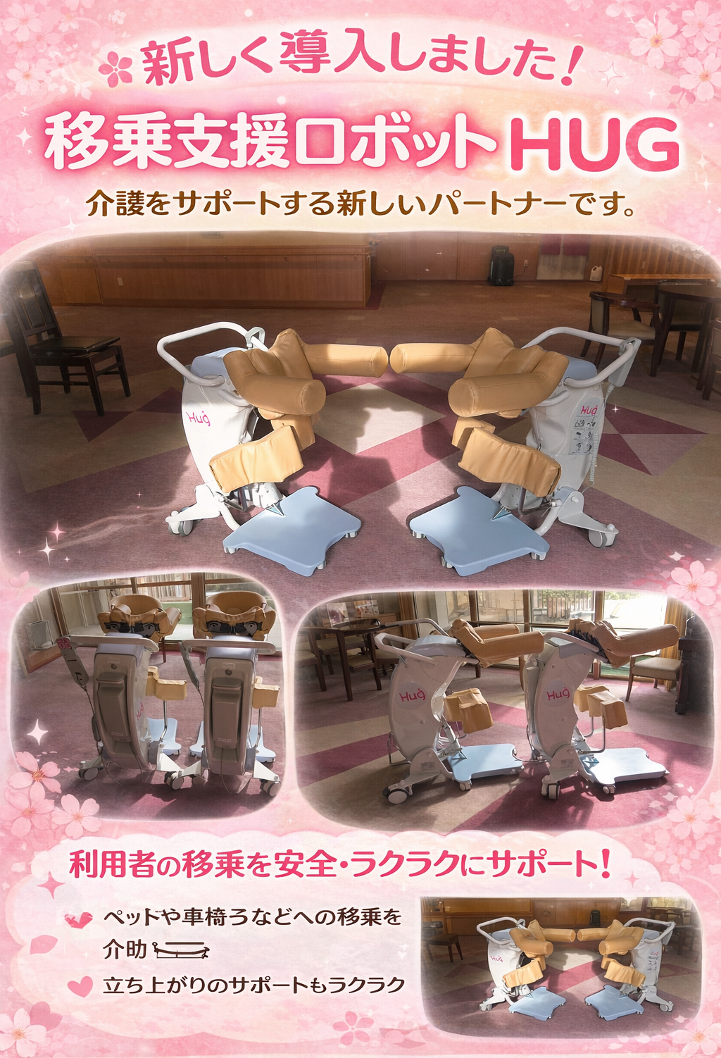 このたび当施設では、介護テクノロジー導入支援事業費補助金を活用し、**移乗支援ロボット「HUG(ハグ)」**を新しく導入しました。
